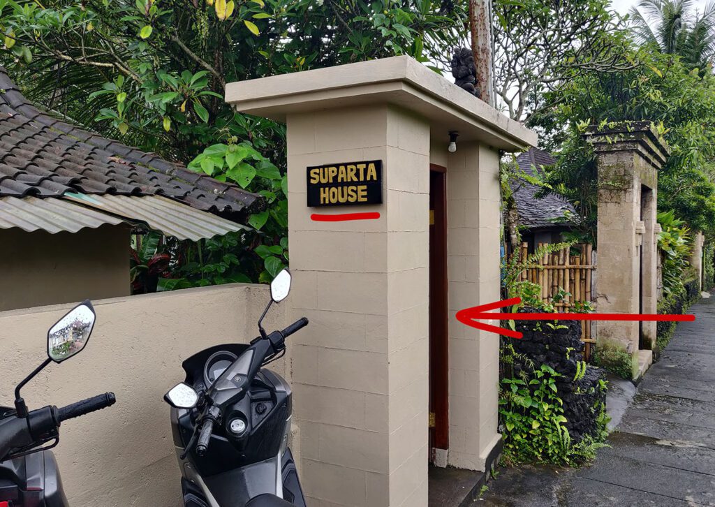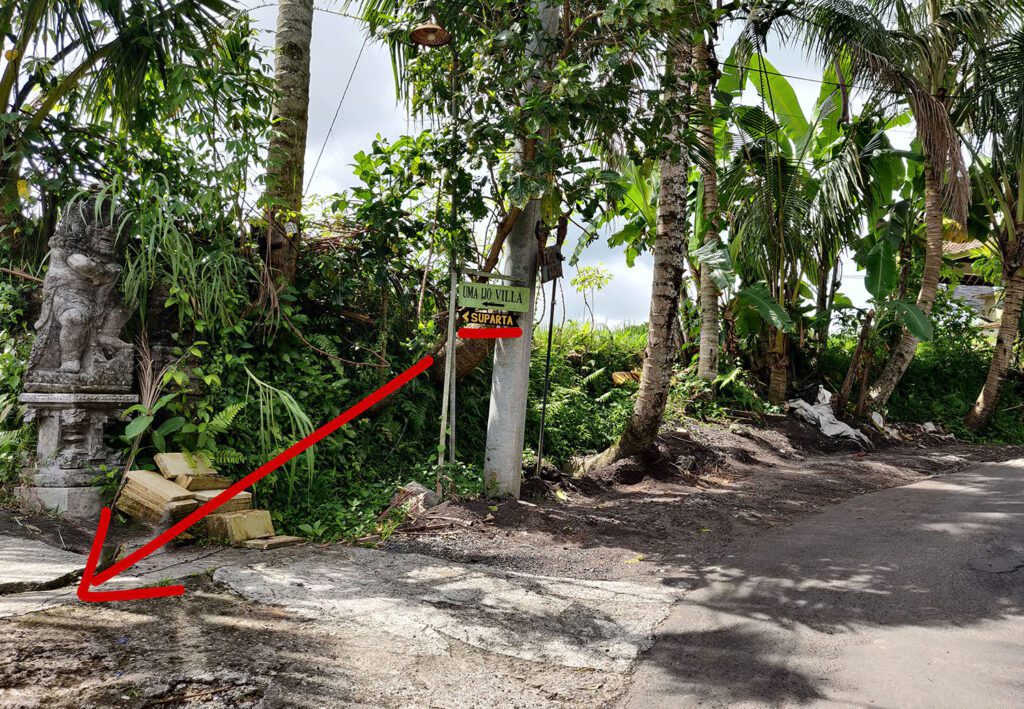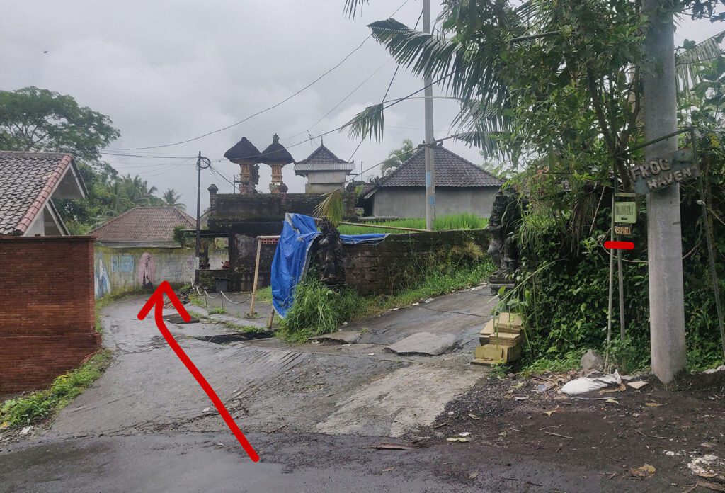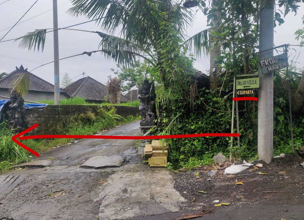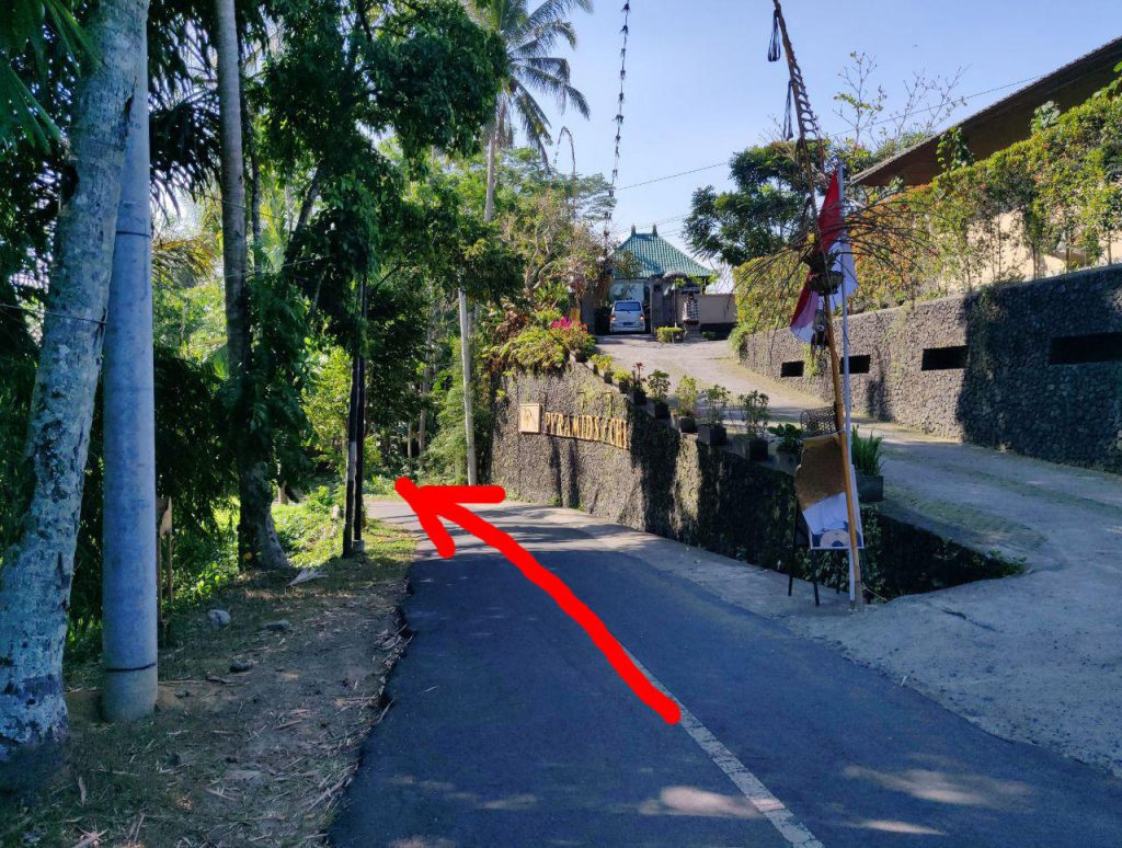Лучше ехать по навигатору по геолокации поворота на Jalan Matahari или точке на карте Warung Pengkolan, потому что до дома навигатор чаще всего прокладывает маршрут на машине проезд с другой стороны реки, откуда не пройти 🙂