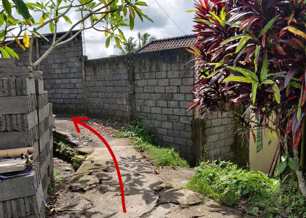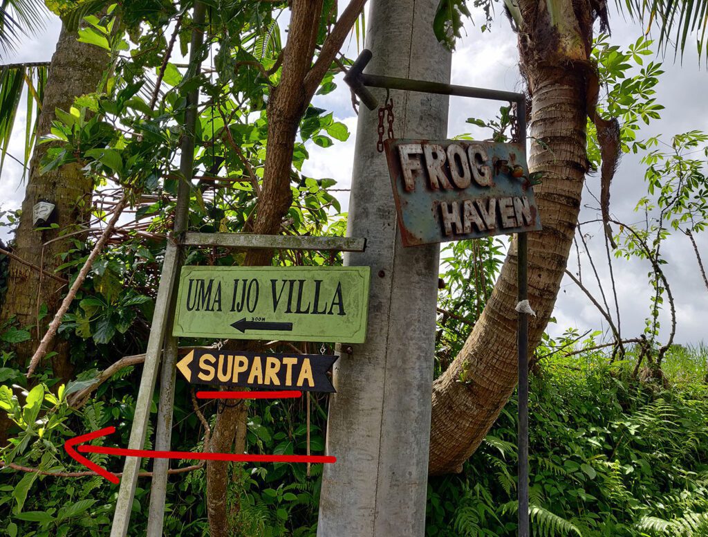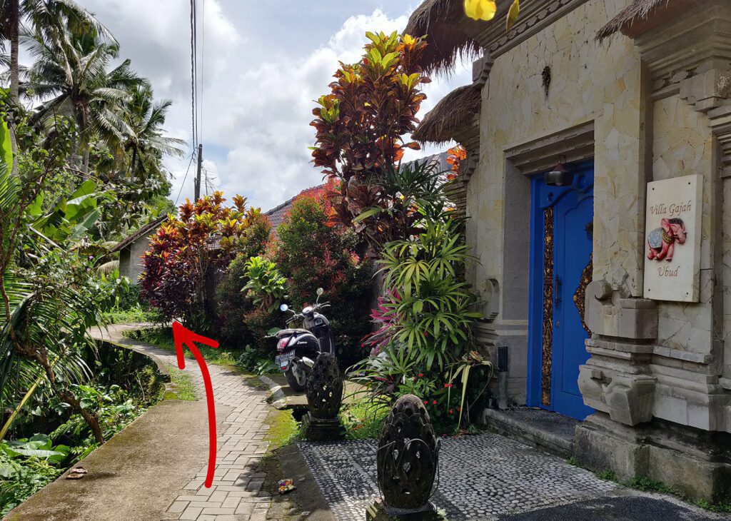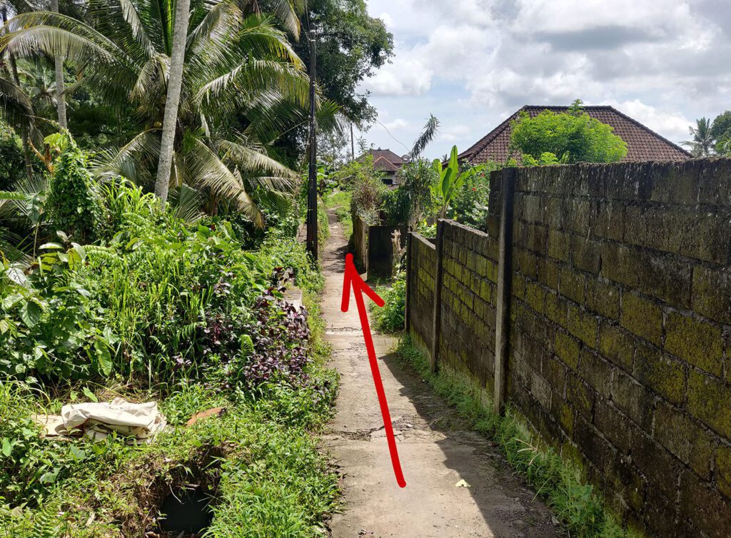 Лучше ехать по навигатору по геолокации поворота на Jalan Matahari или точке на карте Warung Pengkolan, потому что до дома навигатор чаще всего прокладывает маршрут на машине проезд с другой стороны реки, откуда не пройти 🙂