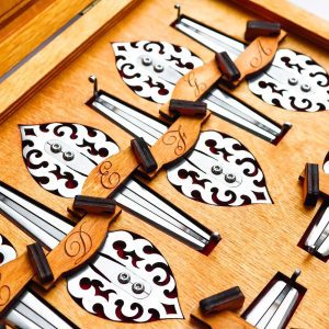 A set of eight jaw harps tuned precisely to notes in the range from C minor to C major octave. The length of the body, tongue and rigidity varies depending on the note of the instrument.